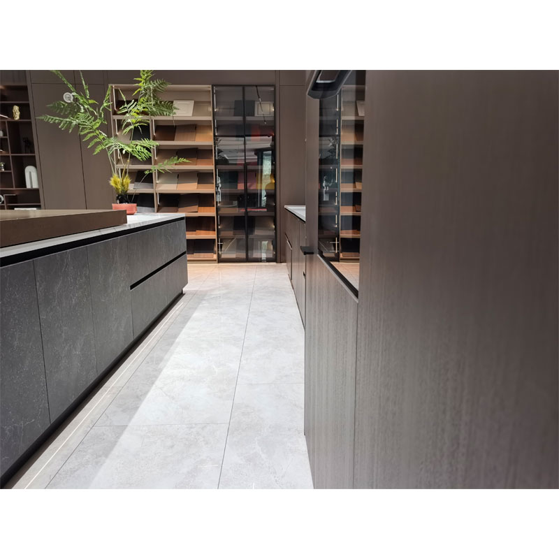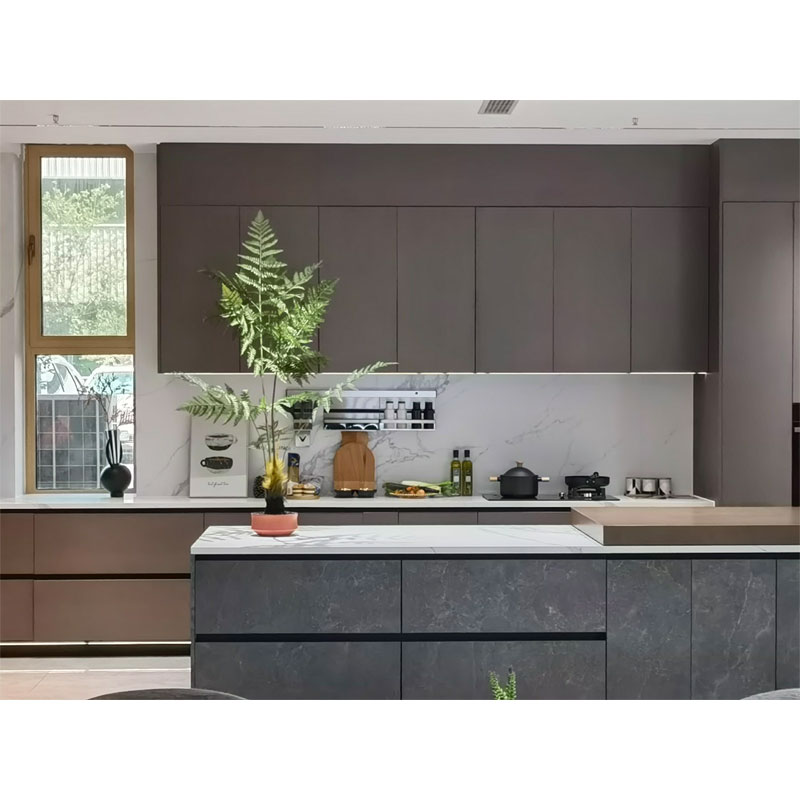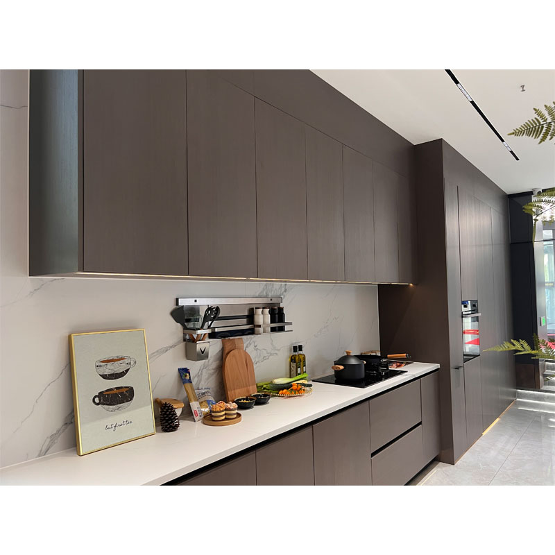 Slimme keuken high-end Laminaat keukenkasten gebruiken overal bruin als hoofdkleur, en de matte textuur is geavanceerder in visueel en handgevoel. Zowel reguliere als onconventionele maten zijn beschikbaar, en L-, L- en U-vormige kasten kunnen op maat worden gemaakt, met vrije keuze van kast- en aanrechtbladmaterialen en kleuren.