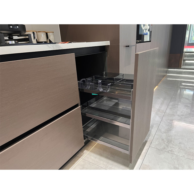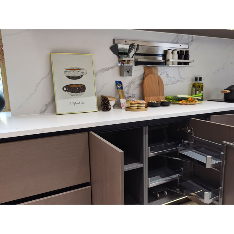 Het karkas gebruikt spaanplaat en hardware van bekende merkfabrikanten. SINOAH biedt altijd kasten met zowel textuur, veiligheid als duurzaamheid voor alle gezinnen. Het interieur van de slimme keuken high-end laminaat keukenkasten kan worden uitgerust met verschillende functionele hardware volgens uw behoeften, en de keukenbenodigdheden kunnen worden gesorteerd en geplaatst. De ruimte in de kast kan volledig worden benut door creatieve ontwerpen zoals uittrekbare opbergmanden en opbergplanken met draaitafels, waardoor het dagelijkse koken en eten handiger en comfortabeler wordt.