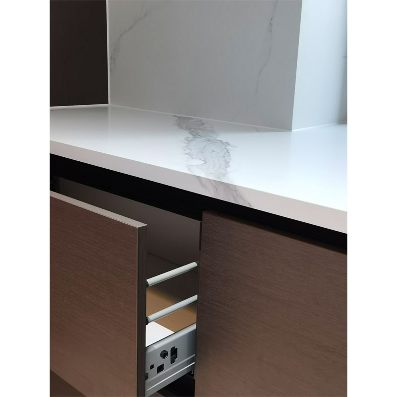 Het werkblad van slimme keuken high-end laminaat keukenkasten zijn gemaakt van kwartssteen, dat glad aanvoelt, mooi is om naar te kijken, gemakkelijk schoon te maken, sterk en duurzaam.